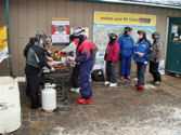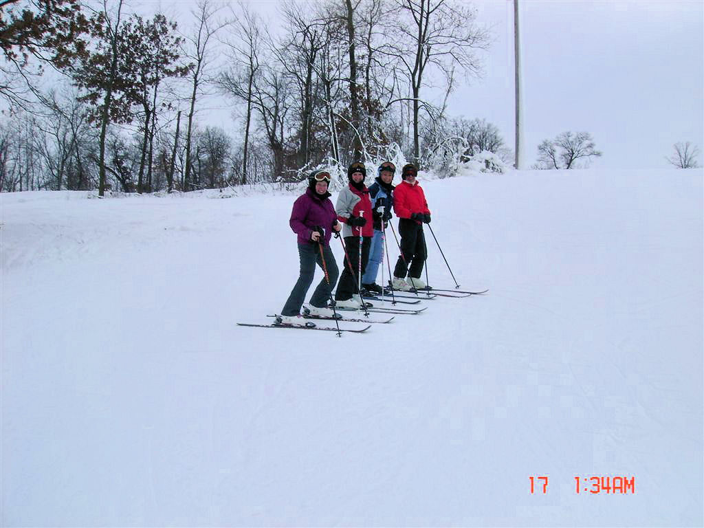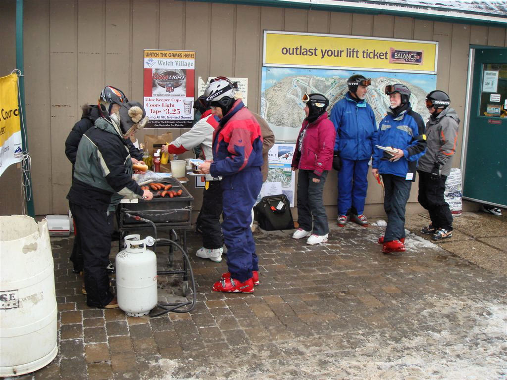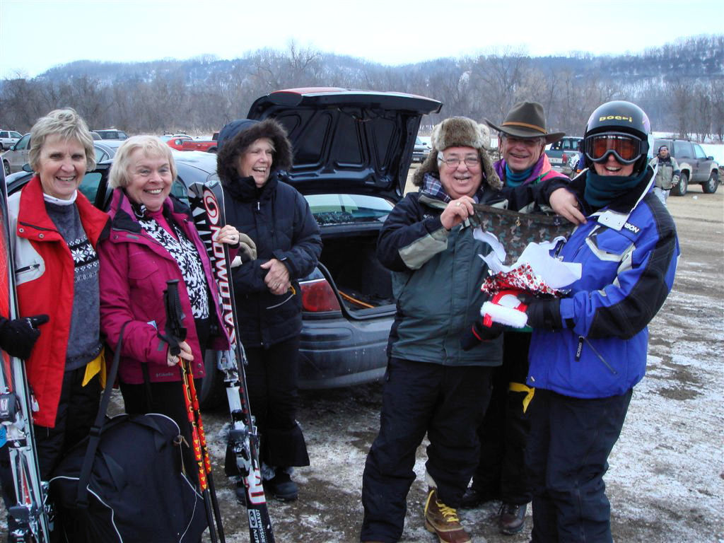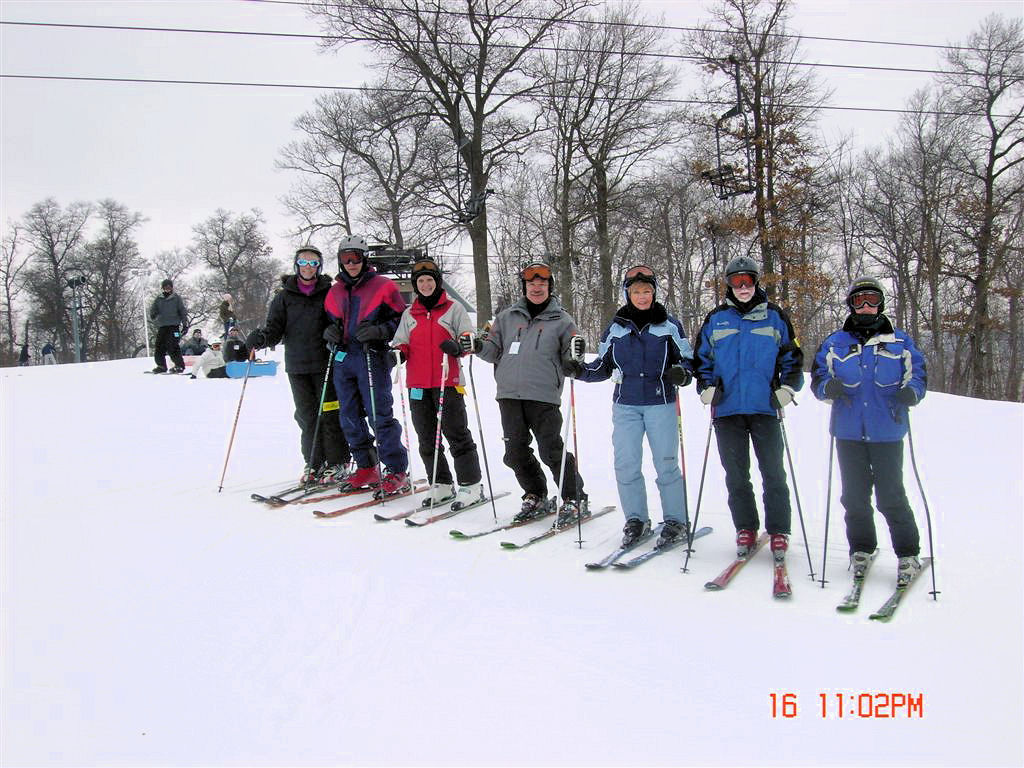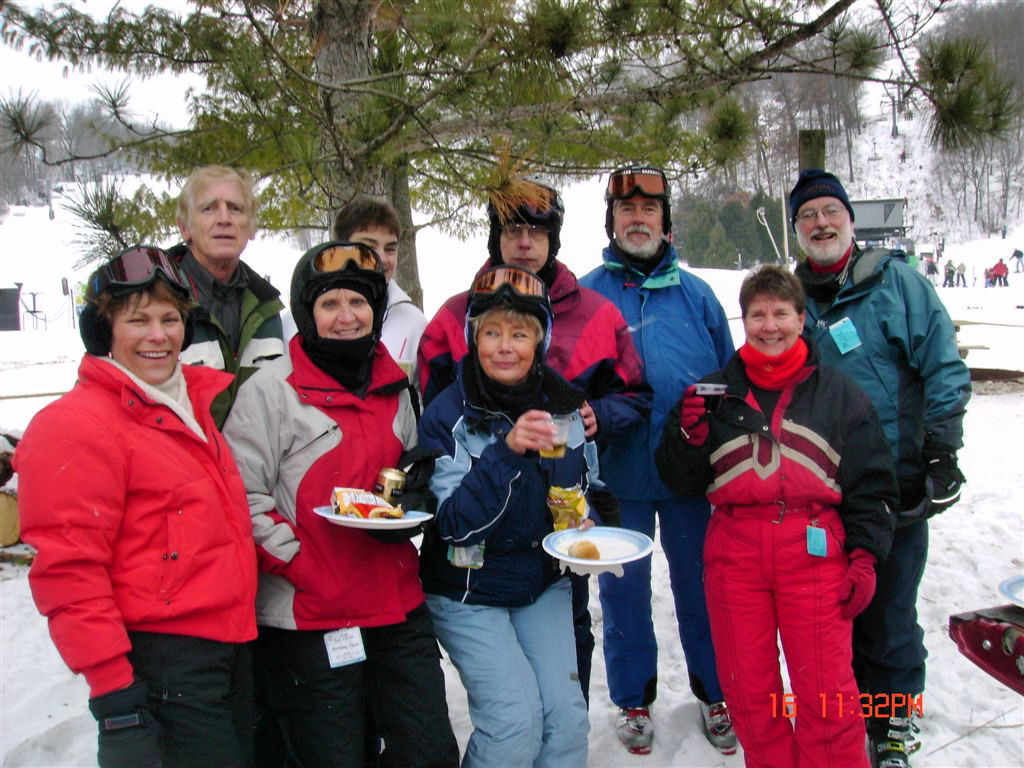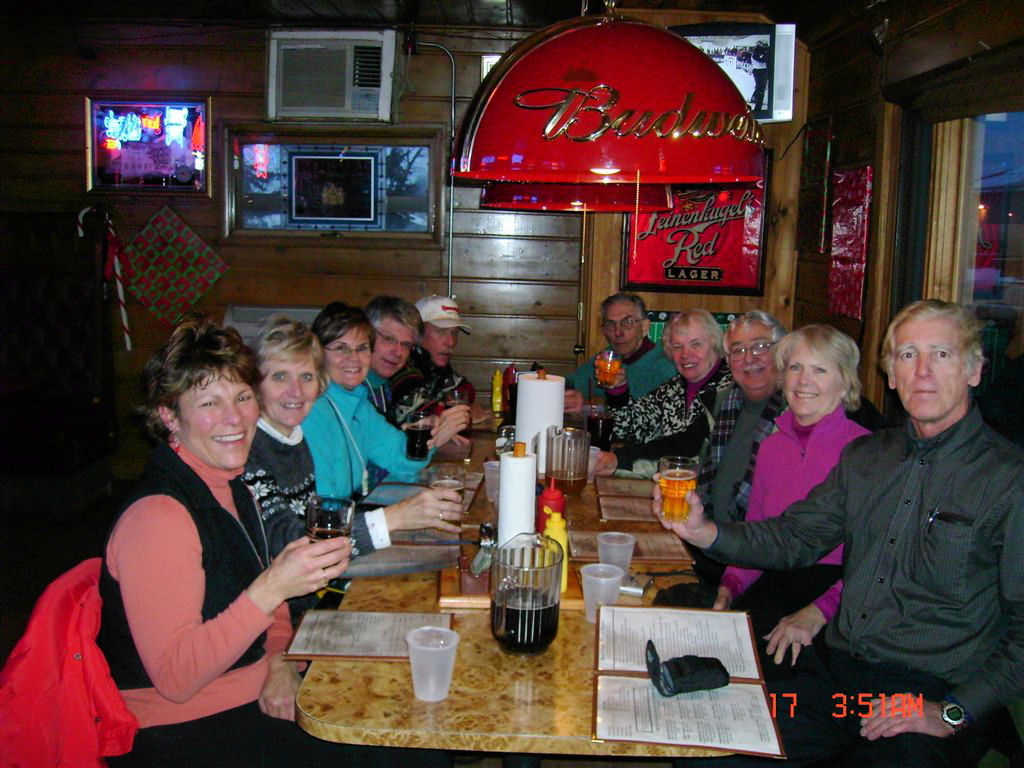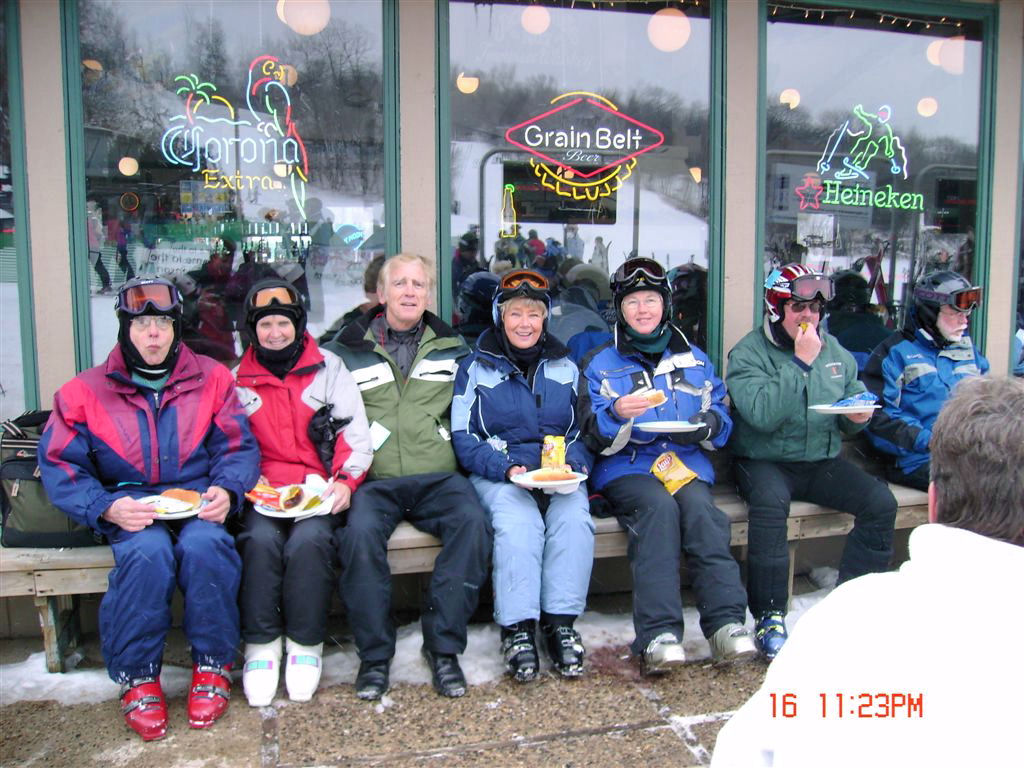A week before the event I found out that a Media Race with 100 to 200 participants was scheduled for the same day, eating lunch at the same chalet at the same time, using the charcoal grill on the patio that we planned on using for cooking the burgers and brats furnished by Ullr club. Our lunchtime was moved up so we would be done before the racers ate, and a four-burner gas grill was rented, unfortunately the pressure out of the gas regulator was so low that three of the four burners had to be shut off to obtain barely adequate heat out of one burner. Our great chef Ali Kalish saved the day and made do with our poorly performing grill. The brats which required less cooking time were cooked first, and the burgers were cooked second, aided by the tinfoil Ray Hartmann managed to acquire for placing on top of the burgers to retain sufficient heat to thoroughly cook them. The snow conditions were good, and we had a fun day of skiing. At the end of the day we went to Kings Place in Miesville for dinner.