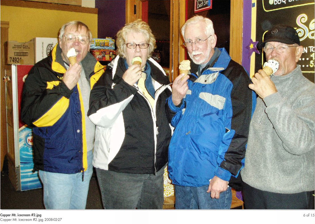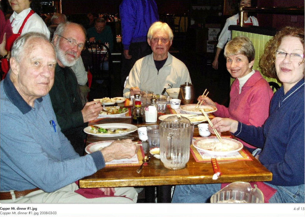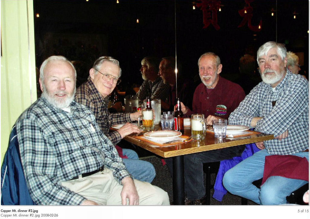 Some people talk about warm weather paradise - WELL, 34 of us had winter paradise in Copper Mountain, Colorado from 02/24/08 to 03/02/08. 11” of snow the first day and 6” the next, and just a few flurries the next few days. It was a little hard skiing the first day, but the next five days was like you would imagine skiing in heaven. Dick Brown’s suitcase and Dave Walberg’s skis did not arrive with us in Denver, but they were delivered the following day, so it all worked out. We had a great pizza party at Tucker’s Tavern. The pizzas were excellent and hot right out of the oven.