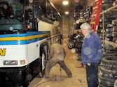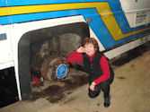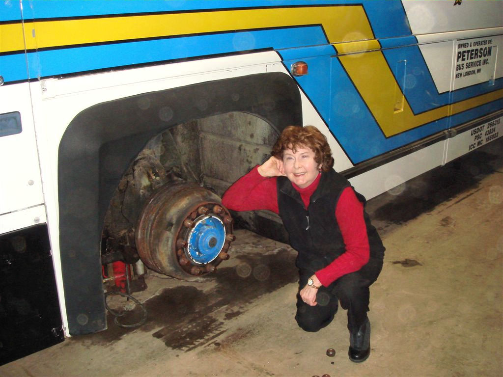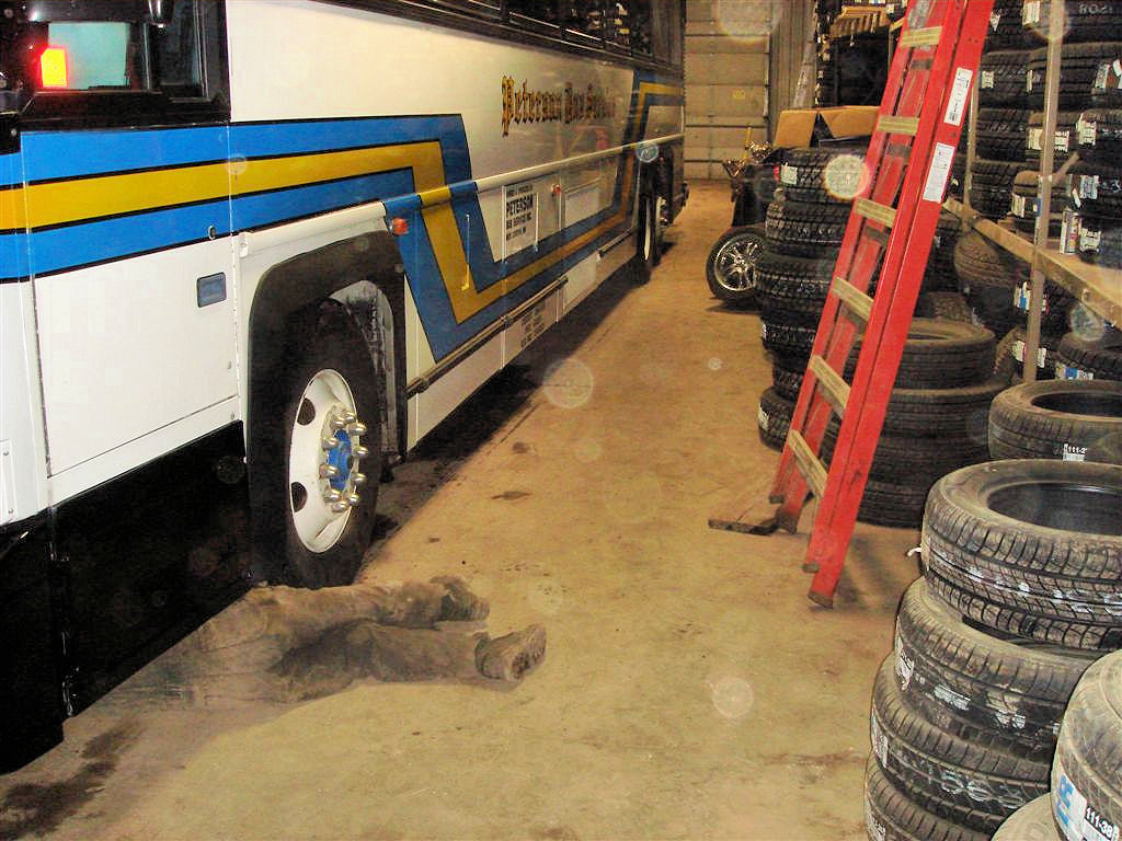 Our bus trip up on Friday Eve gave us a first, in having to make a stop to repair a tire. The bus tire had a slow leak. We made a couple stops for air, but before we were heading into the barron country north of Clouquet, the driver decided it was safest to have it repaired. I had never been in a Bus Tire Repair
