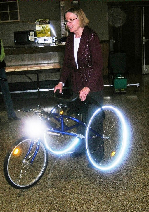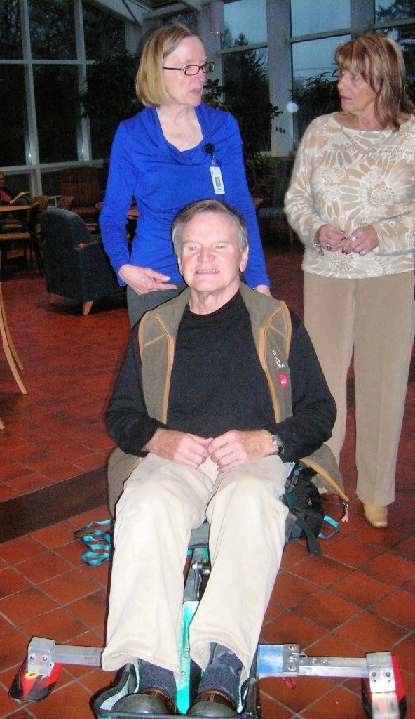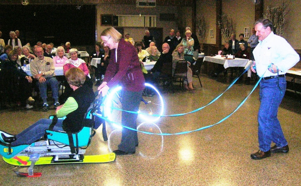 Shown demonstrating the “race runner”, Jenny Walsh from Courage Center explained that this equipment is used for assistance in stabilizing runners. ULLRs have donated in the past toward purchase of this equipment, as well.