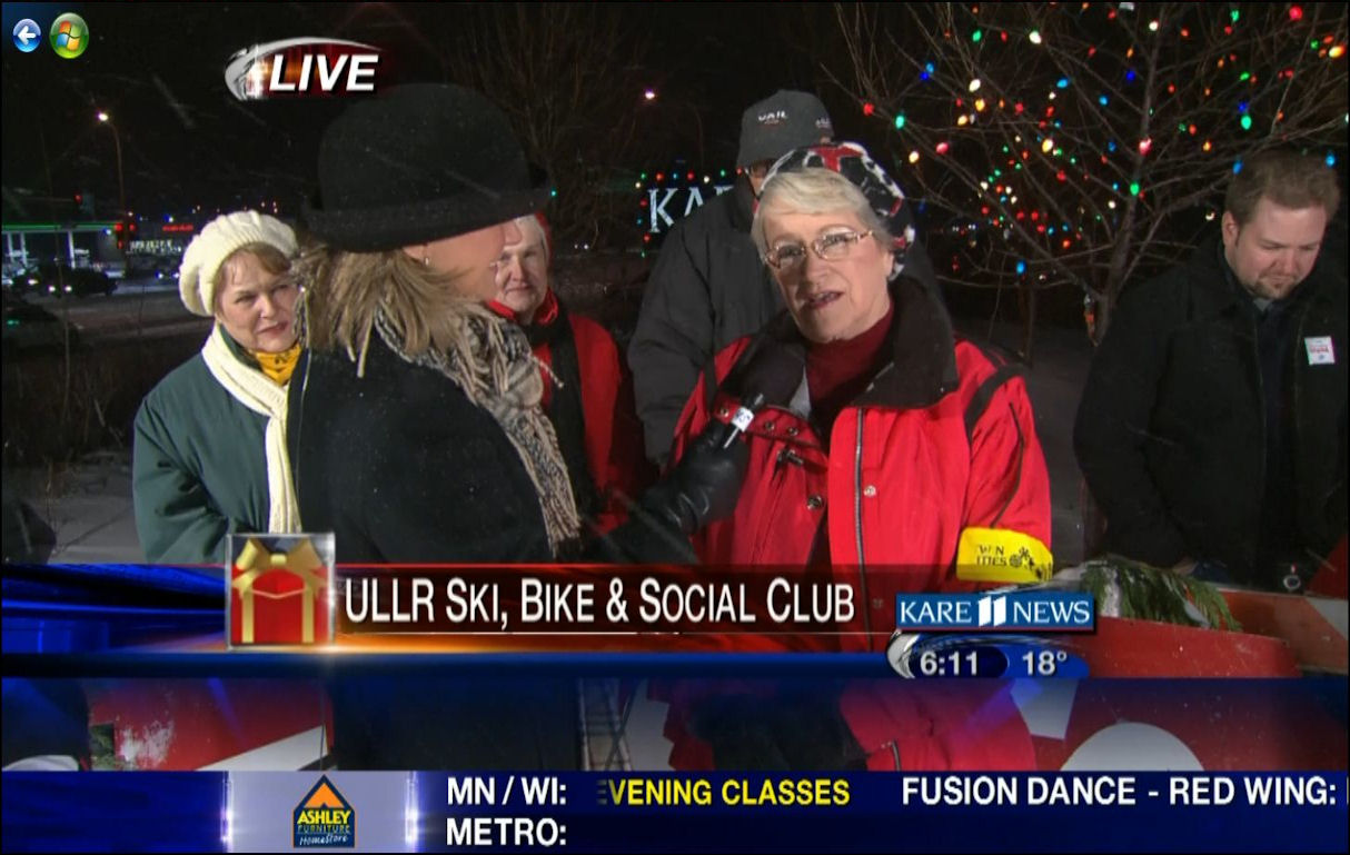 On Tuesday, December 8, five ULLR members braved wintery weather and roads to attend the Marine sponsored Toys for Tots portion of the KARE11 Television News Broadcast. Members participating in the broadcast were: Colleen Barden, Diane Erlandson, Erl Erlandson, and Vicki Johnson.