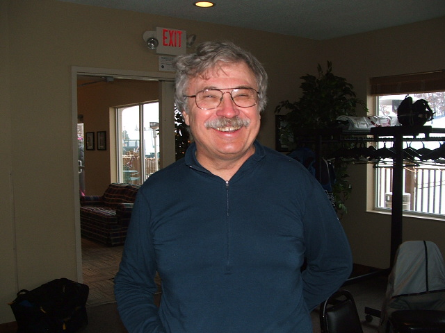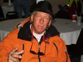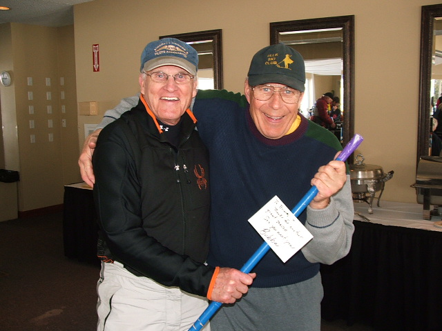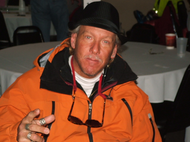 The week before this picture was taken Brian caught an edge and took a trip over the top of the 5' safety fence and wound up hanging upside down with his boot entangled in the top of the fence. While everyone looked on in shock only Torch had the presence of mind to come to the rescue and untangle the boot. The fence did not fare well and the next week the race staff had a special presentation of the broken pole and some of the other pieces to the character on the right. |