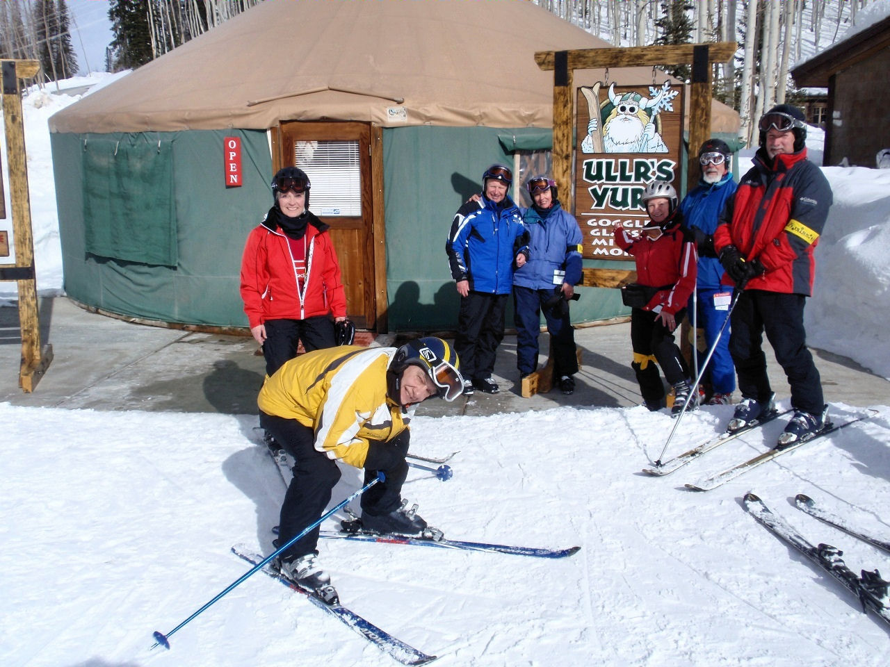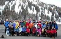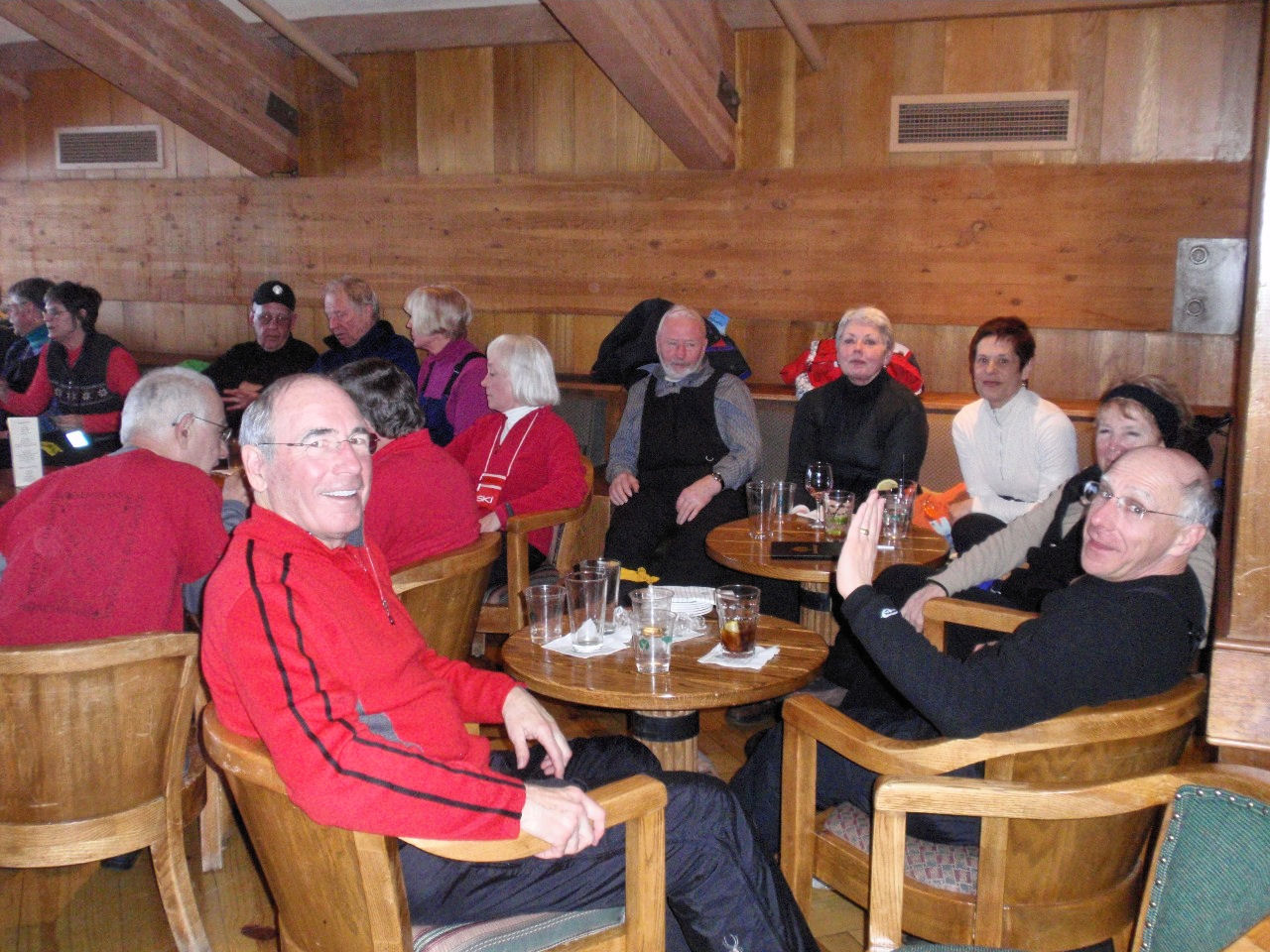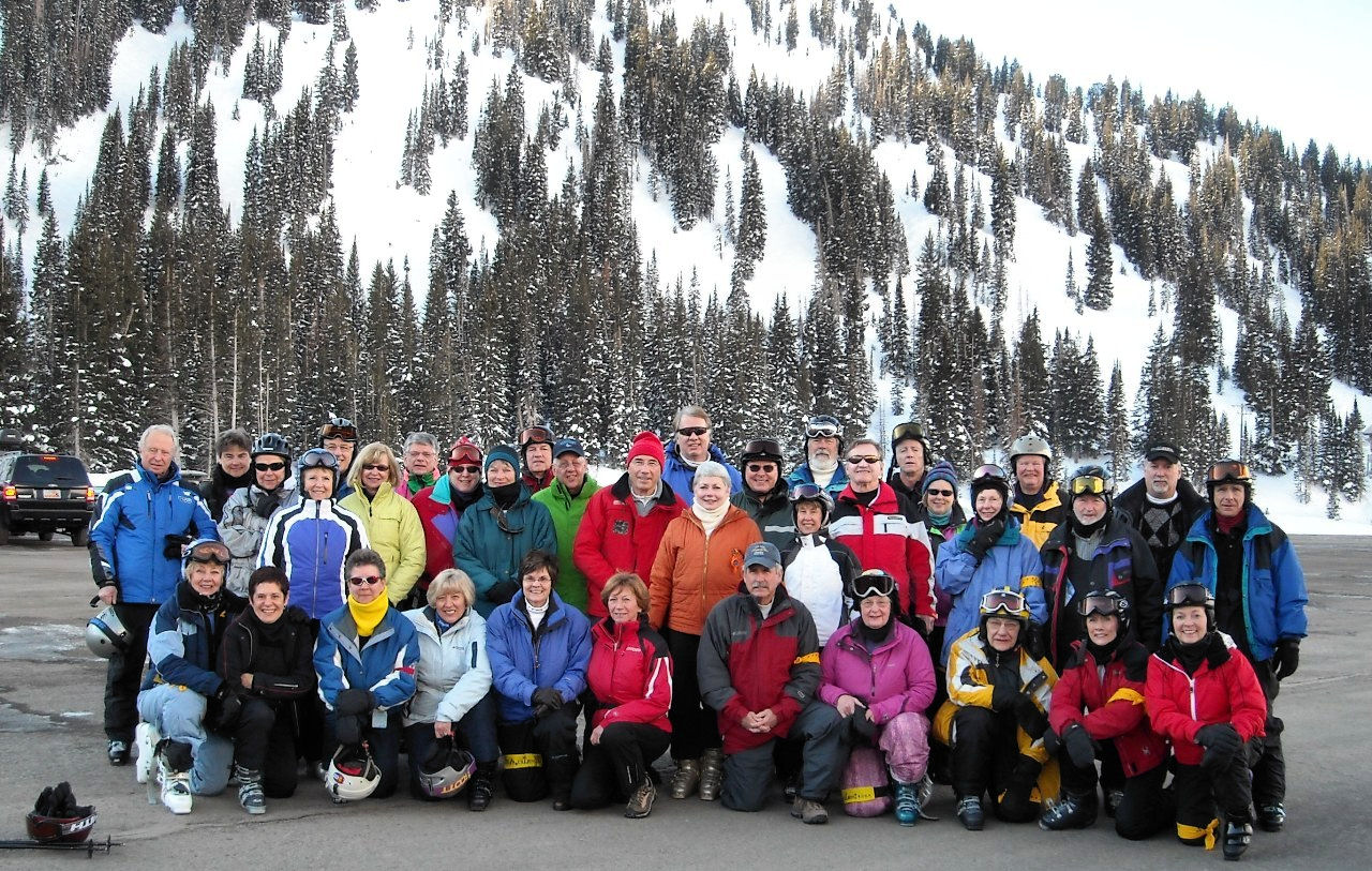 Social highlights: Our Welcome Party the first evening held in the atrium of the SLC Embassy Suites (our home for the week) was a great opportunity to start expanding our friendships. We broke away from the traditional Pizza Party, and enjoyed a sit down dinner of Lasagna, Caesar salad, etc. After dinner, most of us stayed to watch the last quarter of the Superbowl. How spoiled we all became with gathering every morning for a made-to-order breakfast of our choosing and a “Happy Hour” served every day from 5:30 to 7:30 pm – each at no extra cost to the group. The gatherings each morning and evening proved to be a great way to get to know everyone more intimately and by the end of the week we were all ONE BIG family taking up a lot of space in the Atrium with our tables snaked together with chattering skiers huddled about.
