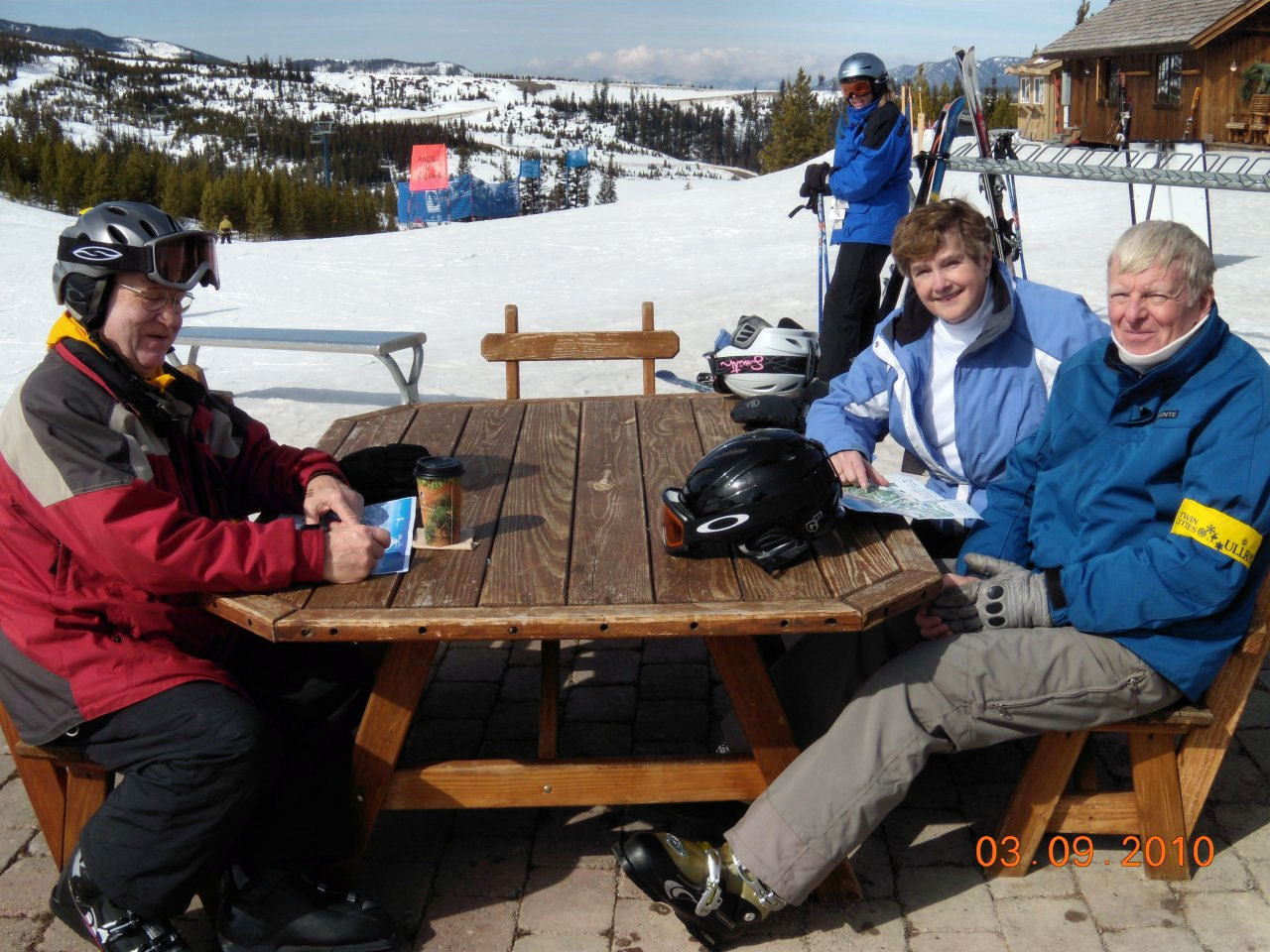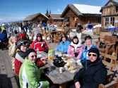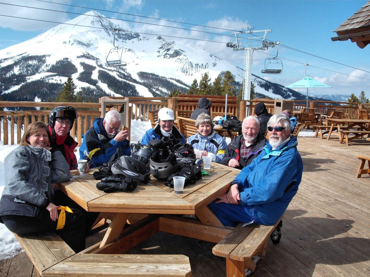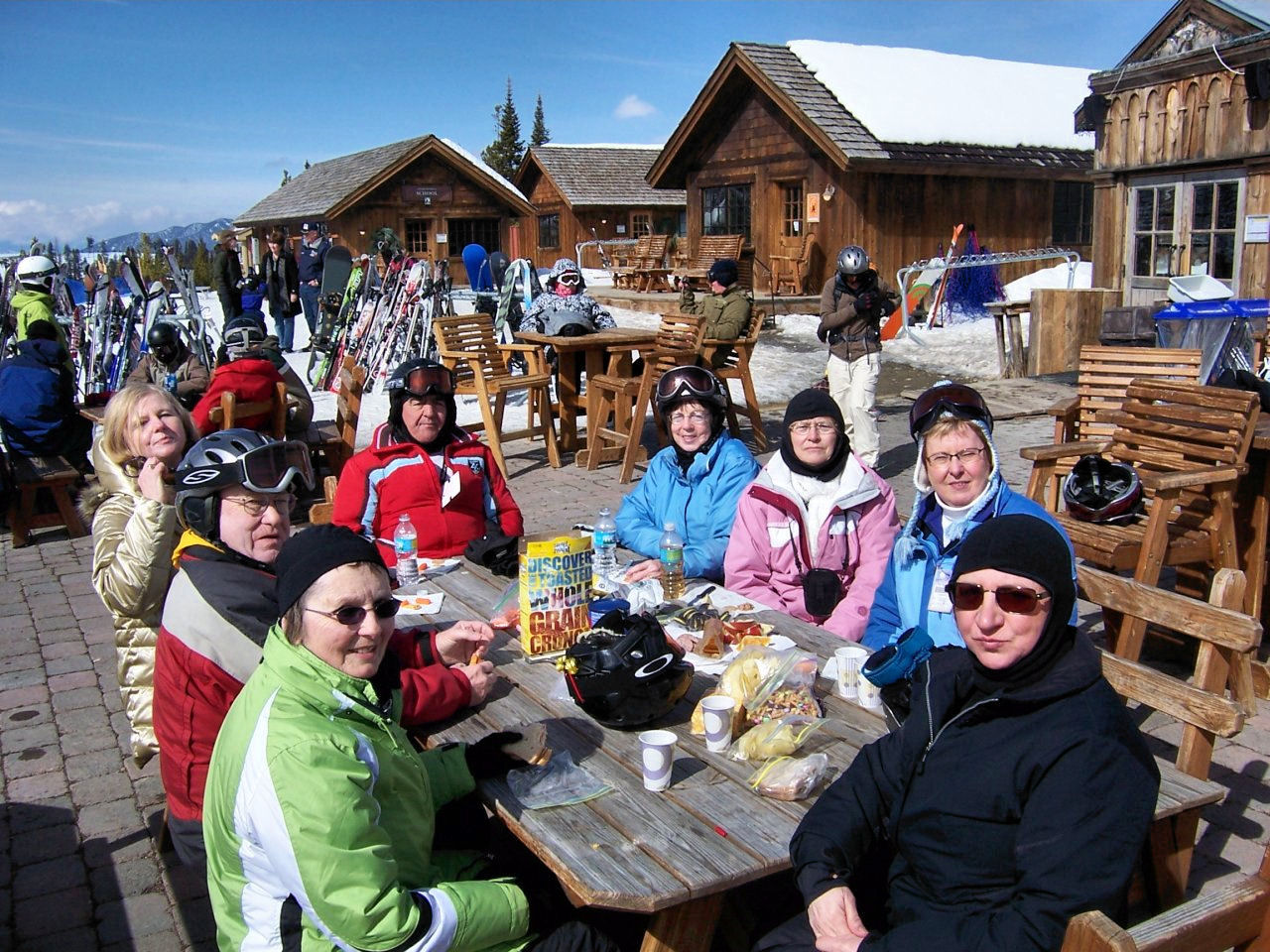Mountain managers from both ski areas greeted us at our Welcome Pizza Party at our Big Horn condos upon arrival. Name tags help us learn the new faces. However, as our week progressed nicknames stuck - like Bode Miller (Jim H), Alberto Tomba (Lee E), Jean Claude Killey (Bruce W), Lindsey Vonn (Nancy H), Peekabo Street (Sylvia S), and the Studettes. Lone Mountain Peak was a trip highlight at 11,000+ ft with a memorable gondola ride from which we took movies of Smoking Joe skiing down its double black face, WOW! Runs like Grizzley, Challenger, the Bowl, and Liberty each produced special memories/adventures. We are happy to note no one reported a ski injury, but one finger was stepped on by a stocking foot at the Leftover Party.