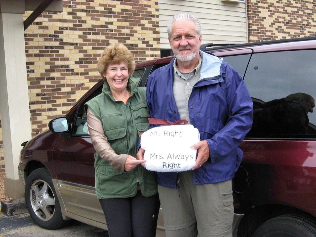 Here are some pictures from our Lake Wobegone ride last weekend. These were taken on the northern route from Albany to Holdingford to Bowlus, MN. We rode over 35 miles on Saturday against strong winds and cold temperatures. The pictures under the covered bridge were taken at Holdingford. The picture of Woody and me was because the group gave us embroidered towels - One said "Mr. Right" and the other said "Mrs. Always Right!"