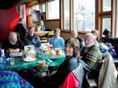 Skiing was cold both days, but the snow was great and well groomed. We had sunshine on Saturday and fresh snow on Sunday. All had fun talking to our old and new friends in the bar/restaurant in the chalet while warming up in-between runs. A delicious Lasagna dinner on Saturday night was enjoyed by all in a private room at the Lodge. Many Traverski members and a few ULLRs were shuttled to the R Bar in Biwabik for dancing and socializing. The only downer on the trip was frozen lines in our bus which delayed our return to Mpls and Rochester, but all took it in stride. We had plenty of room in the Lodge lobby, bar, and restaurant for more socializing, playing cards, reading, dozing and getting the group together for a photo. We arrived at Honeywell’s parking lot very late Sunday evening to find our cars frozen and covered with snow (which is par for the course). I’m hoping the Rochester people caught up on their sleep for the remainder of their trip.