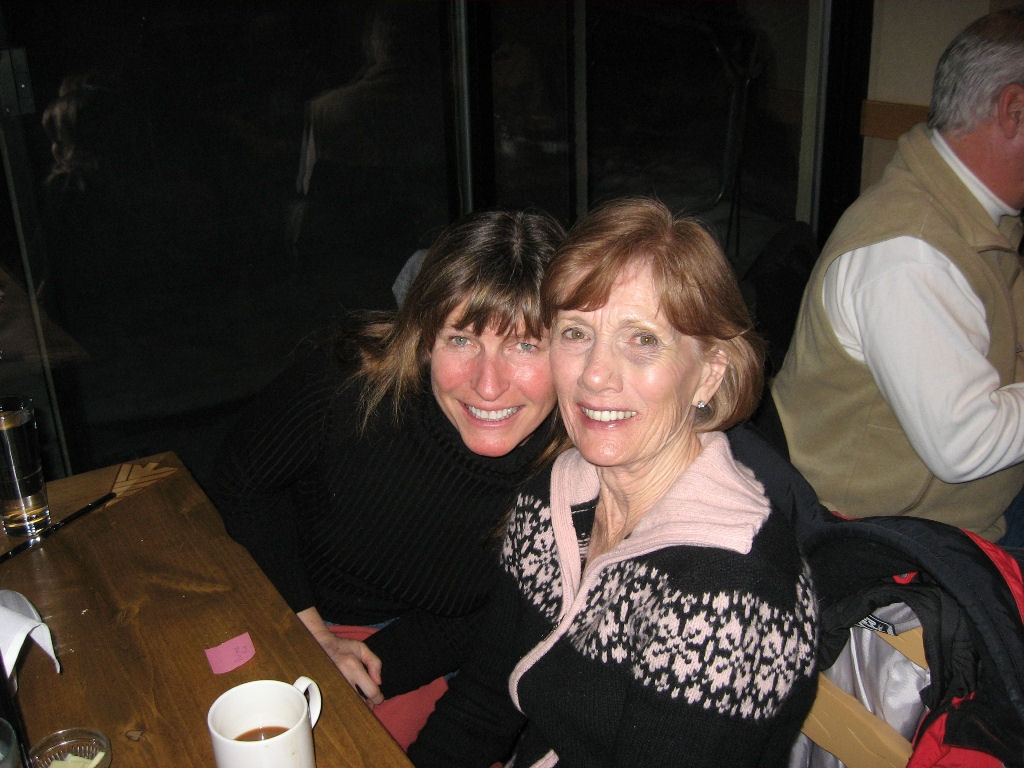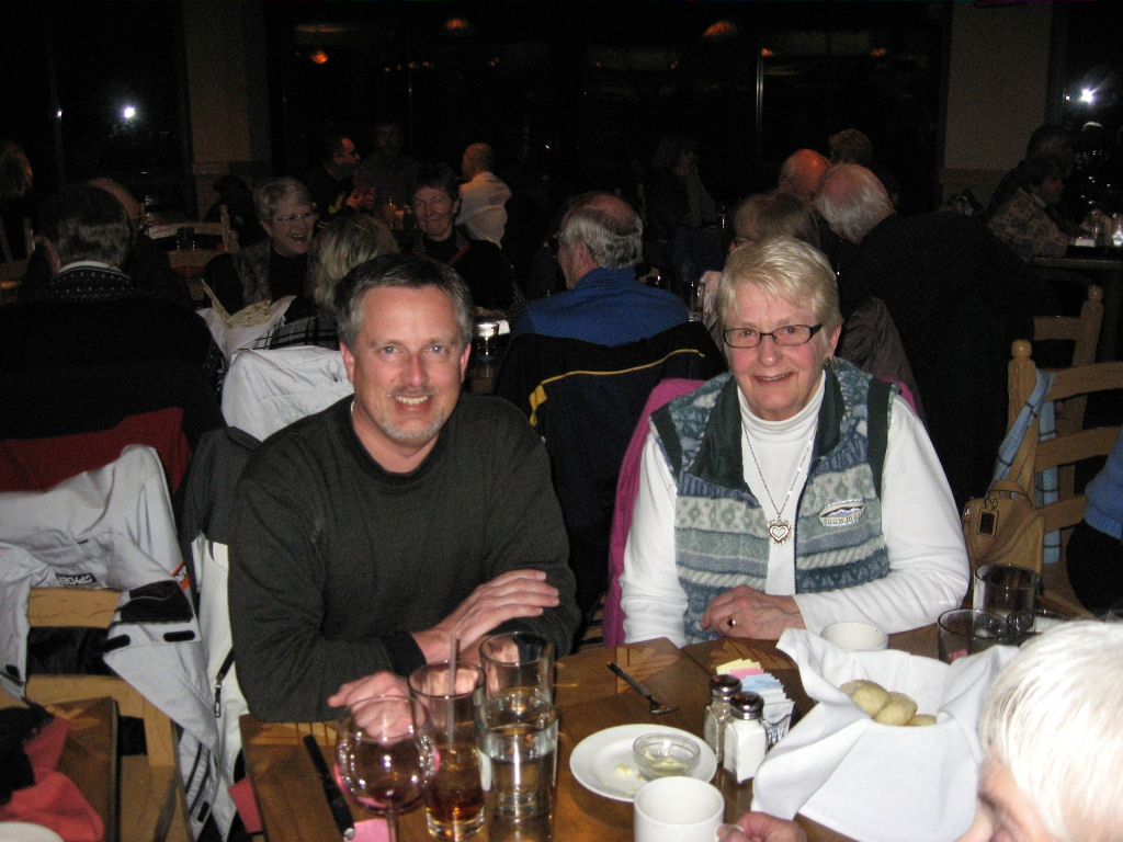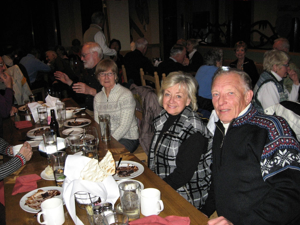 We were so thankful that there were no skiing injuries other than our sore muscles, a jammed thumb, a black eye from a ski pole handle and a boot died. Berit R. was walking to the lift line the first day and her ski boot literally exploded open and disintegrated! She ended up walking back to a table in her boot linings.
