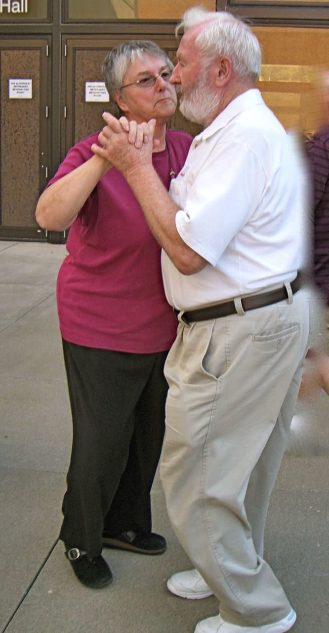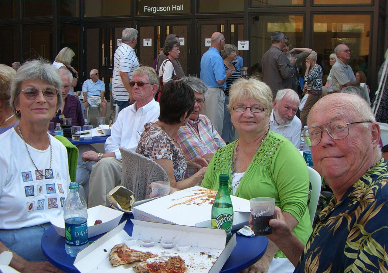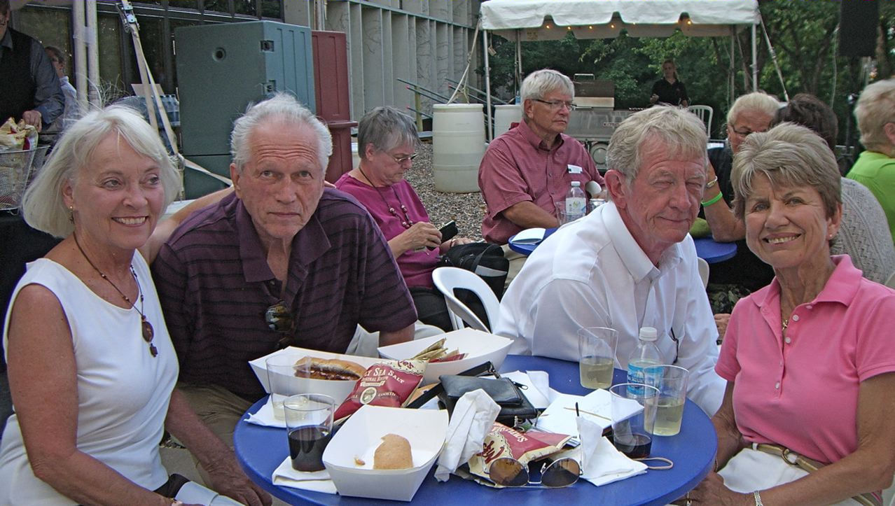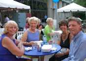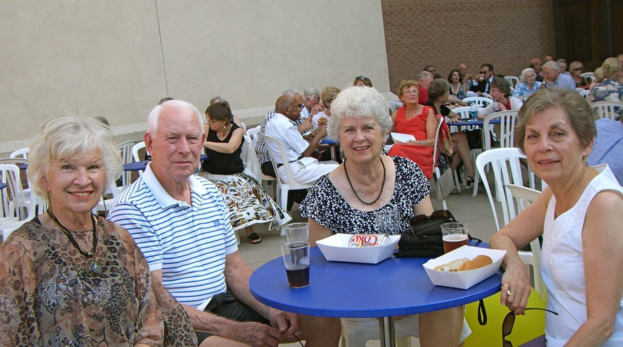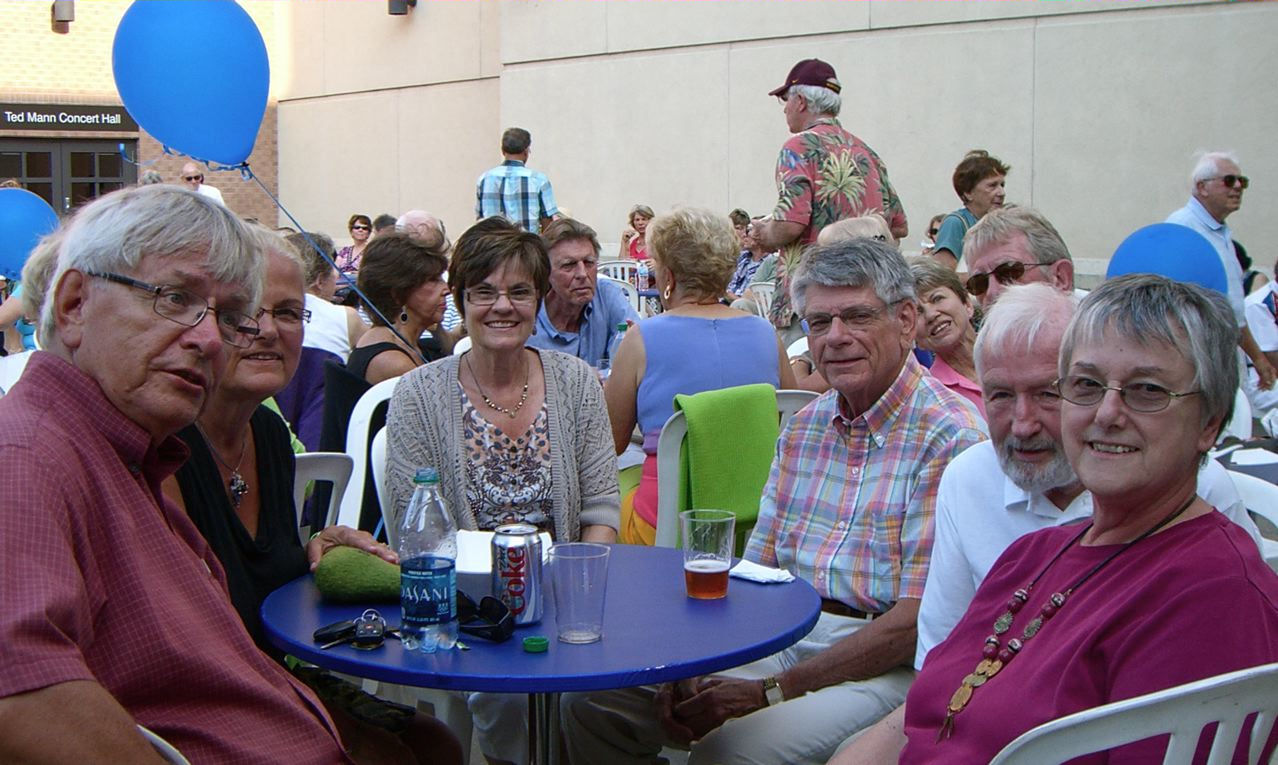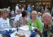 It was one of those scorching days we had all during July - 95 degrees that night of July 14th. The Ted Mann Hall shares a terrace with Ferguson Hall and the two buildings provided much welcomed shade for our pre-concert activities. Brats, hot dogs, beer and wine were enjoyed by our group as we listened - and danced! - to the Jolly Huntsman band. Manfred was the most popular dancer of our group as he was the ULLR most proficient with the dance steps required for the waltz and polka tunes played!