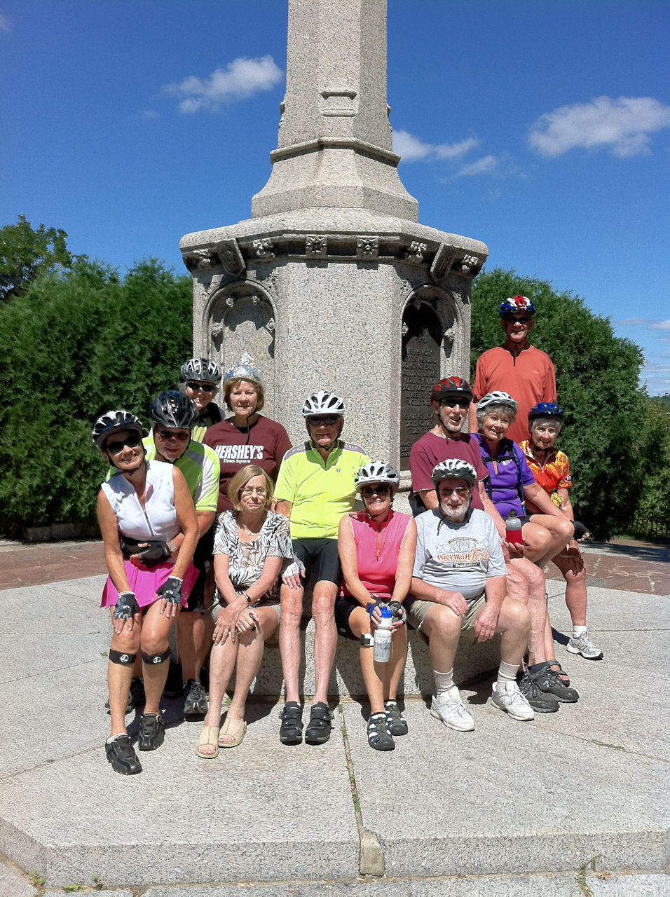 In the past, all Chocolate Lovers' riders created and wore chocolate Hersheys Kisses by wrapping their helmets with aluminum foil, twisting the top, and completed with crepe paper tails on which the words "Hersheys Kisses" appeared. Karen, as the leader, was the only rider this year with a Hersheys Kiss on her head, although the Hersheys Kiss materials are always available at breakfast for making Hersheys Kiss helmets in the spirit of the chocolate theme. This year we had 11 riders departing from breakfast, and picked up 2 additional riders at Minnehaha Falls for the shorter version of the ride. Sherrie drove the sag wagon, guarding our precious cargo of chocolate and picking up any potential broken bikes or broken bodies.