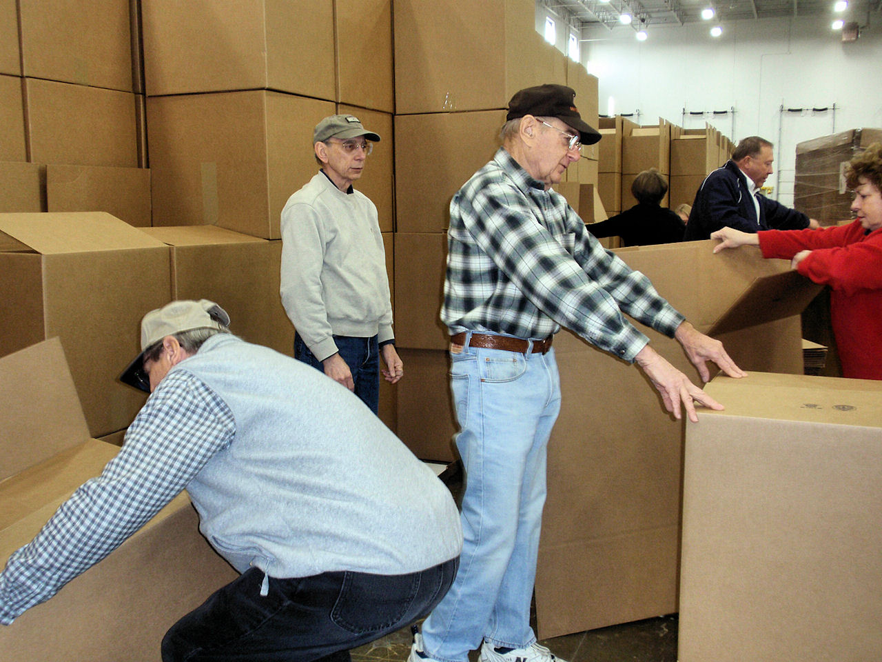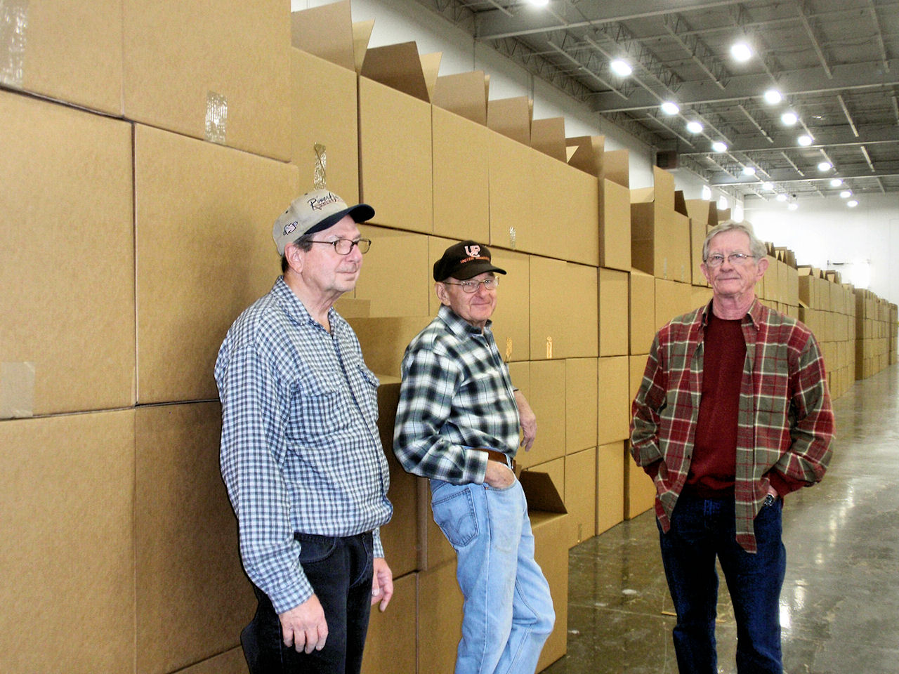 Jim S & brother Tom S moving boxes and folding flaps with Wayne J "supervising" |