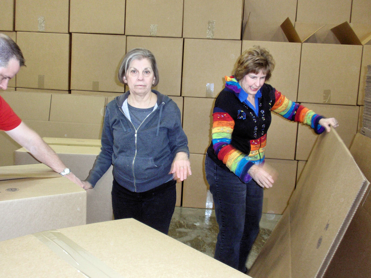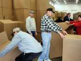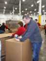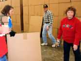 | Sharon T loading toys in boxes | | Tom S, Jim S & Jon Z Whew -- That's a lot of boxes! | | Vickie L & Nancy S Is there a box big enough for this toy? |