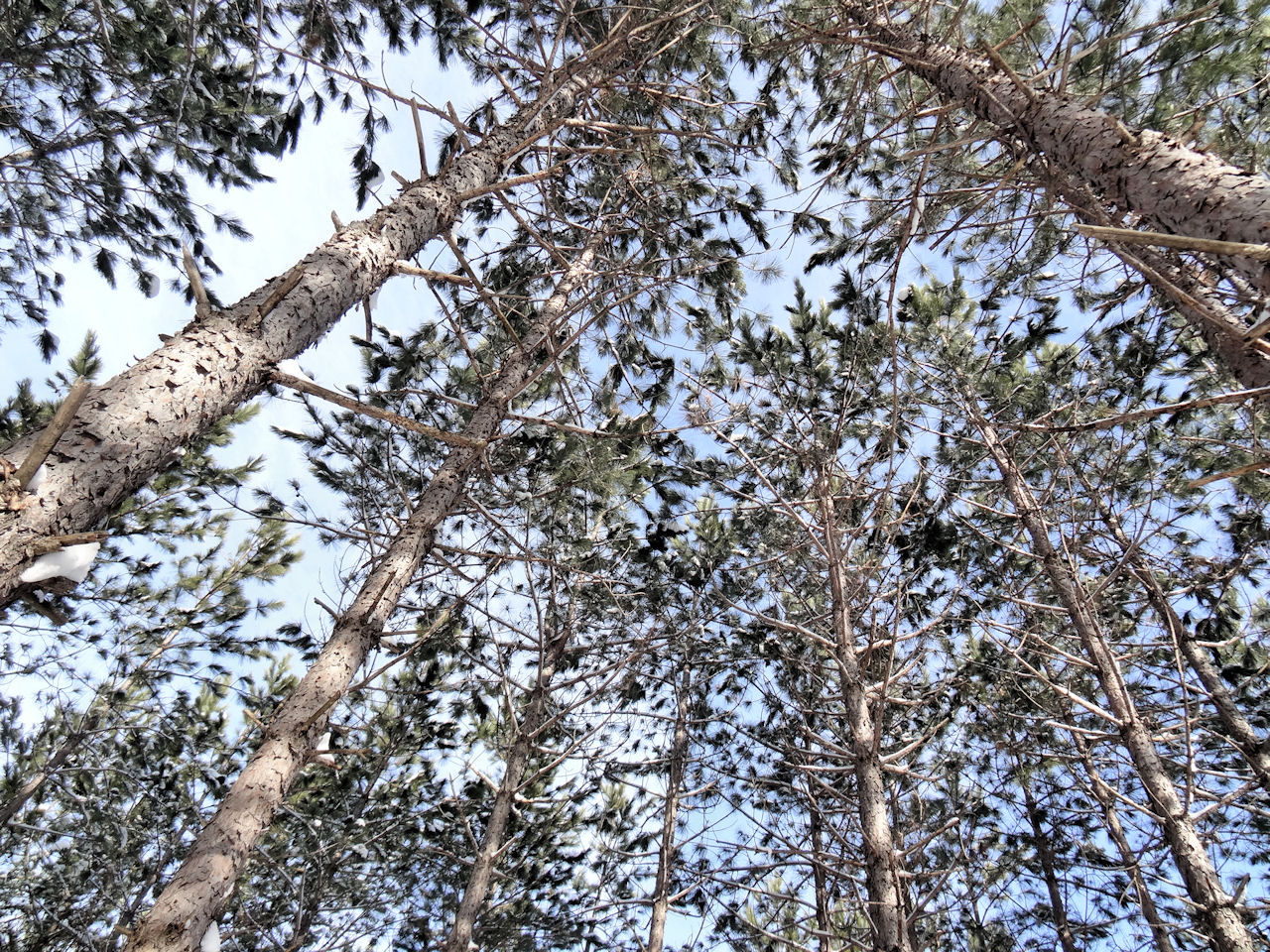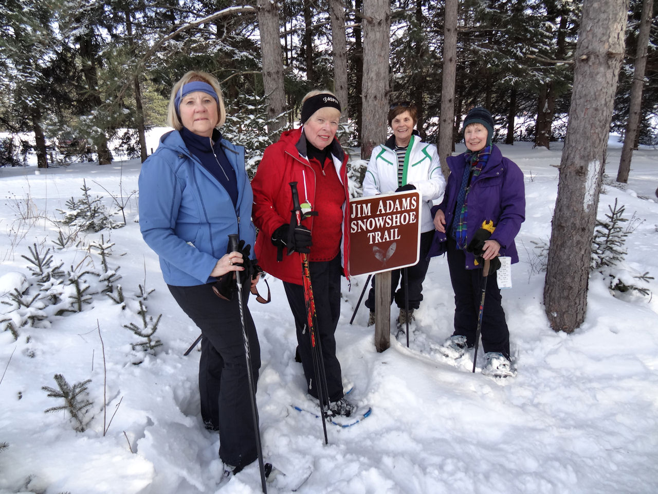 | Lovely view upward into the trees | | Karen H, Barb K, Patty F, Sharon M On the trail | | Lots of snow! |