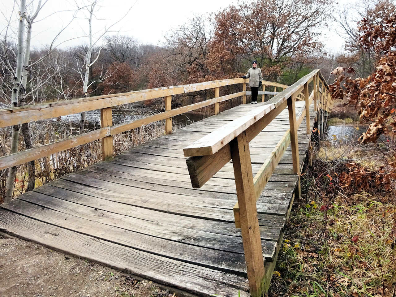 leaf-covered rocks and tree roots, crossed a rickety wood bridge,