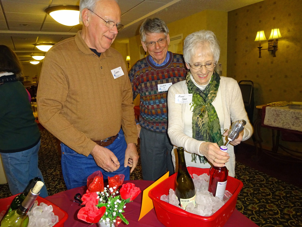 Galen H coaching Mary Jane H on the art of opening wine bottles with John S supervising |