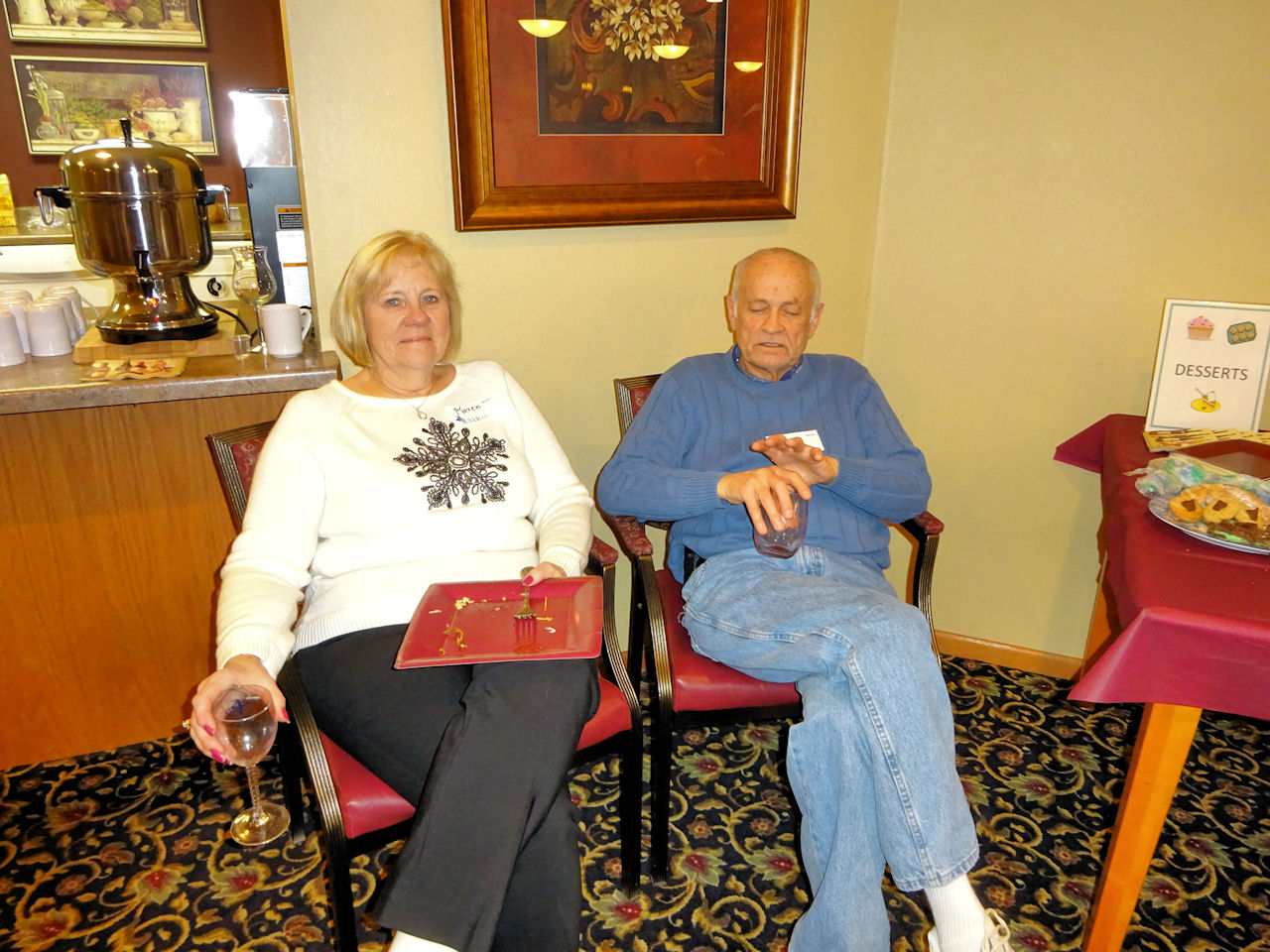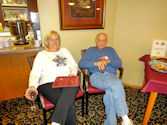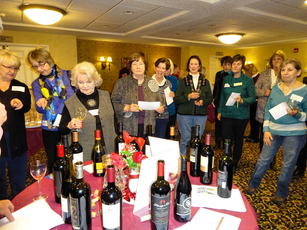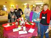 Mary Jane H telling about her white wine with Bill K listening intently | | Look at all the reds -- maybe there is one for each of us! Joyce C, Audrey K, Carol B, Karen G, Judy B, Mary Ellen G, Sandra S, Patty F, Wendy C, Carol B | | Better eat something before we drive home Patty F, Charlie B, John S, Audrey K |