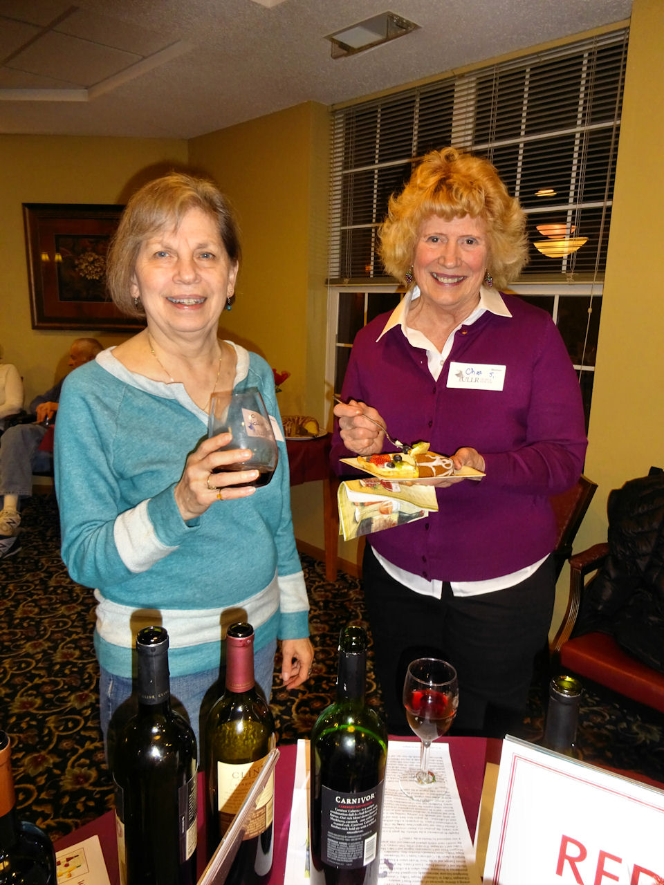 Karen G and Nedra N comparing a couple of reds | | Karen H and George G had the best seats in the room to observe all the activity | | Good wine, good food, and good friends Carol B, Charlane S |