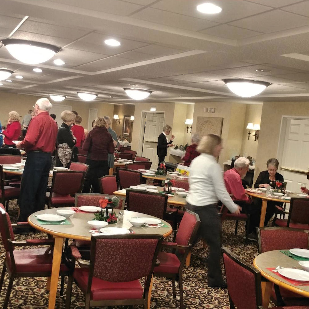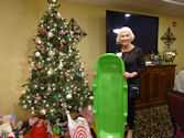 party room nicely decorated with festive Christmas trees and table
