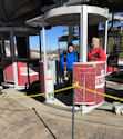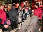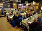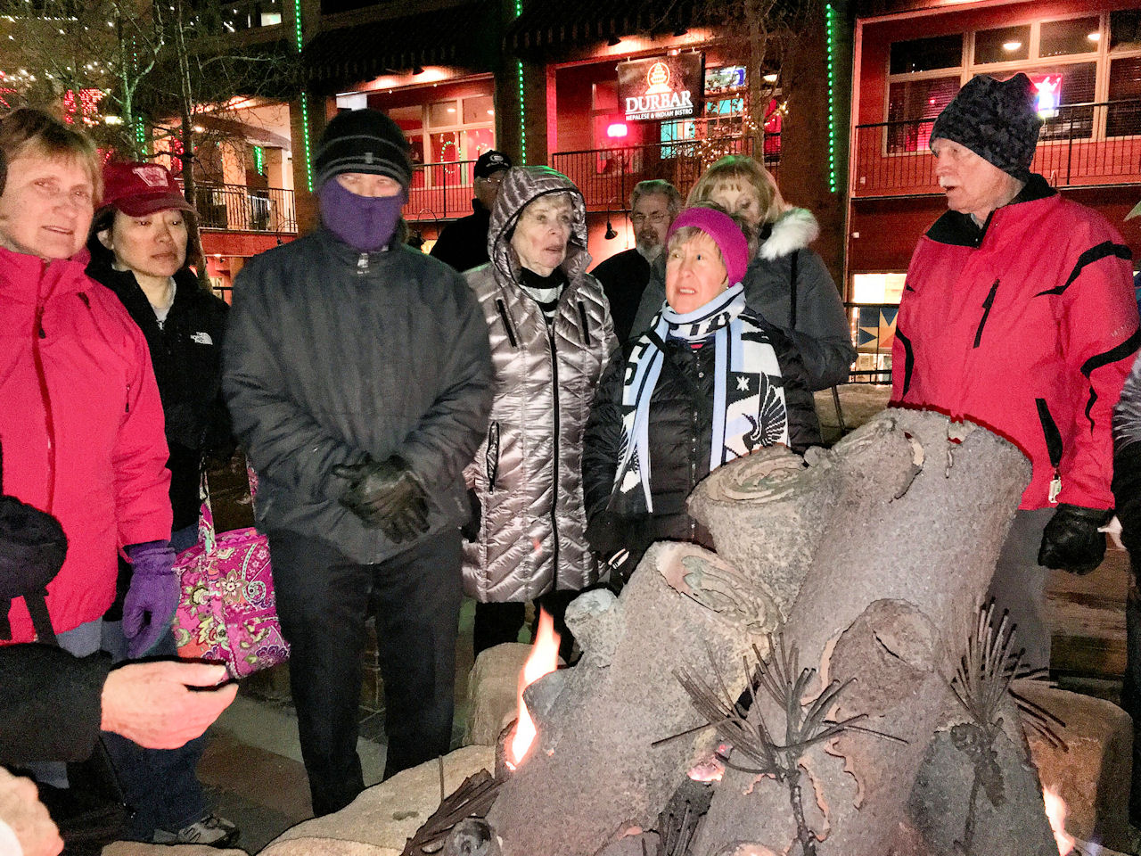 Enjoying our group dinner at Smokin’ Moe’s | | Trying to stay warm by the fire while waiting for bus after group dinner | | Trip Co-Chairs Nancy S and Sharon M |