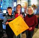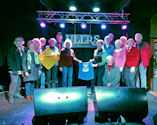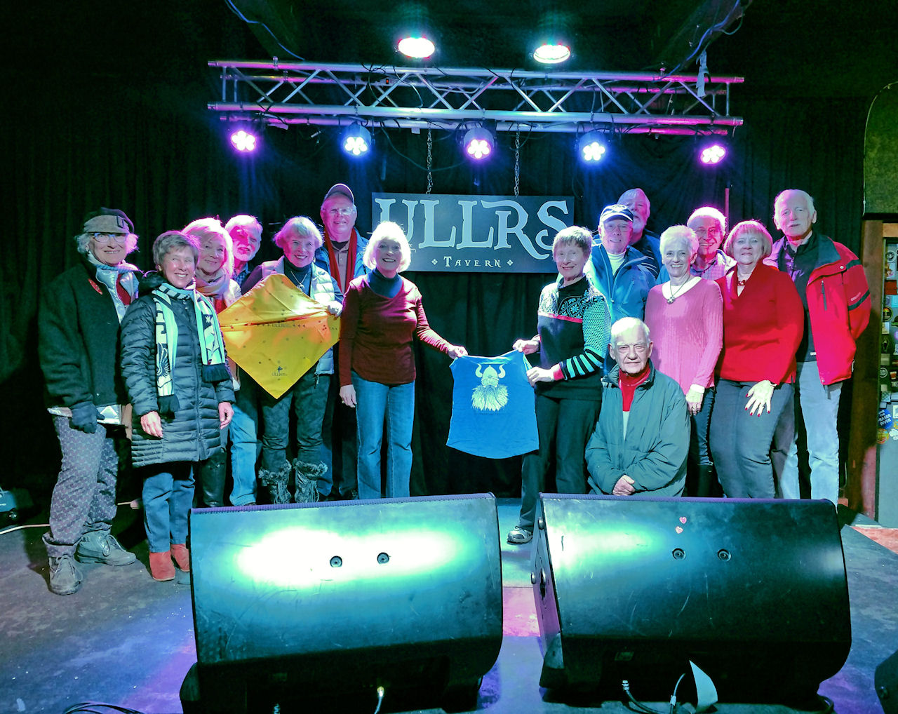 Coca Cola Bear and Wagons Karen H, Marlys S, Barb K | | Presenting ULLR bandana to ULLRS Tavern owner Trip Co-Chairs Sharon M and Nancy S with Tavern owner | | Ullrs on stage at the ULLRS Tavern |