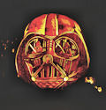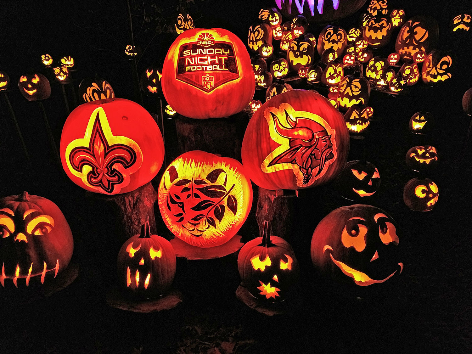 group of pumpkins carved for the Vikings-Saints game, Star Trek, and so