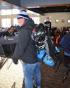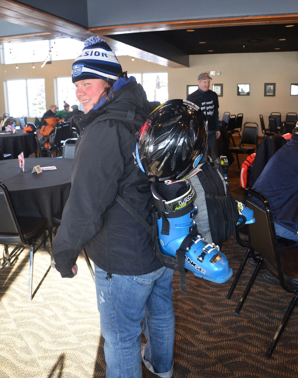 This is Lezley showing off for brand-new ski bag. You hang your boots on the outside and your helmet hangs on top.