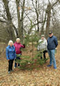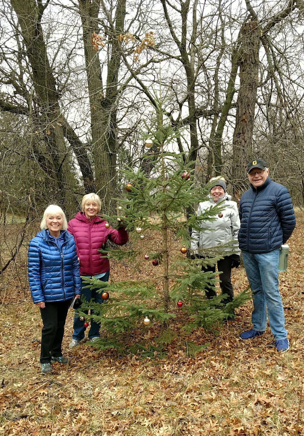 decorated with Christmas ornaments. One thick stand of trees