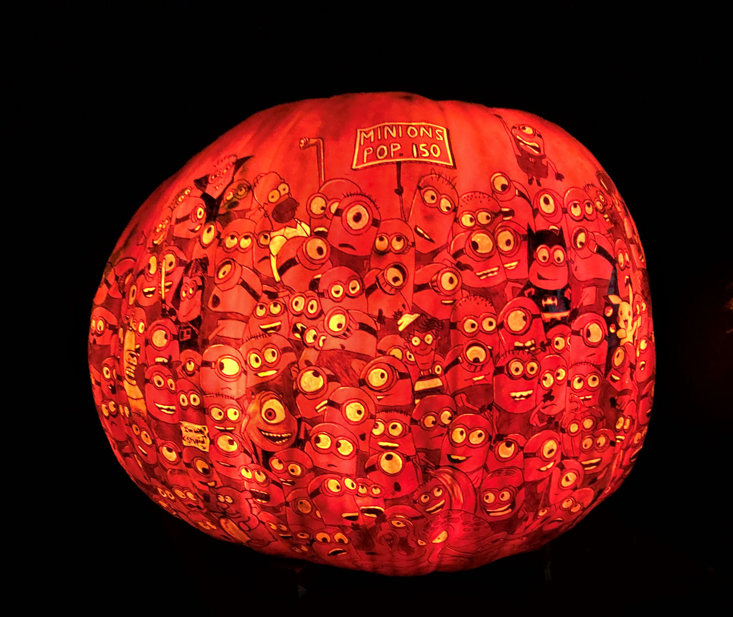 spotted a Waldo! Can you find Waldo on the Minions pumpkin photo?
