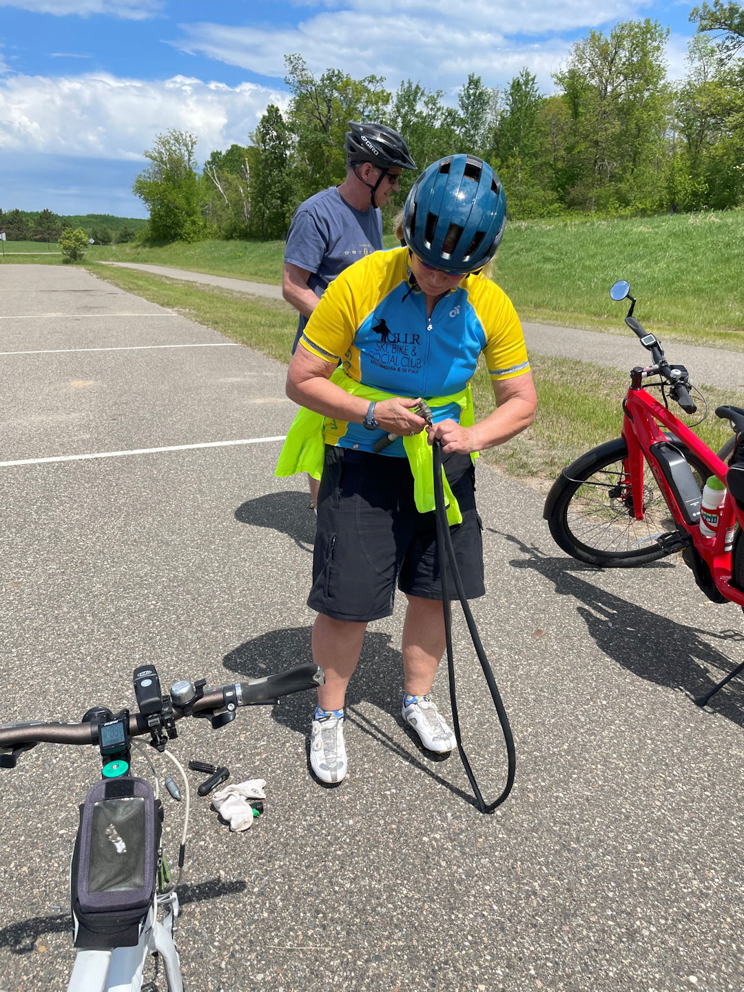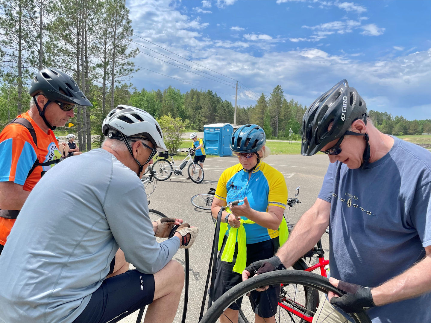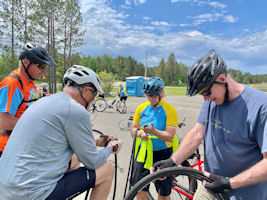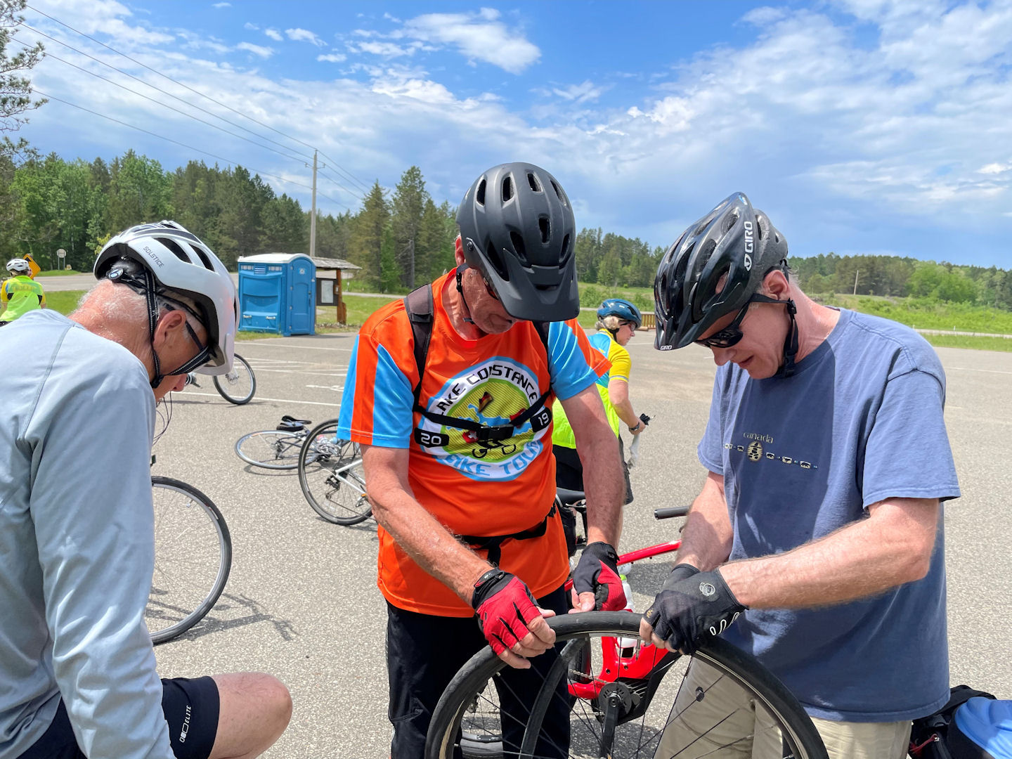 Nancy N fixing a flat tire for Kate C