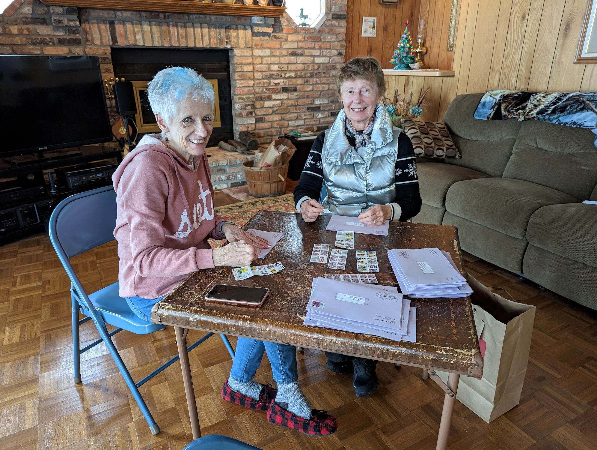 Applying postage stamps Mary Jane H, Sharon M