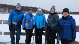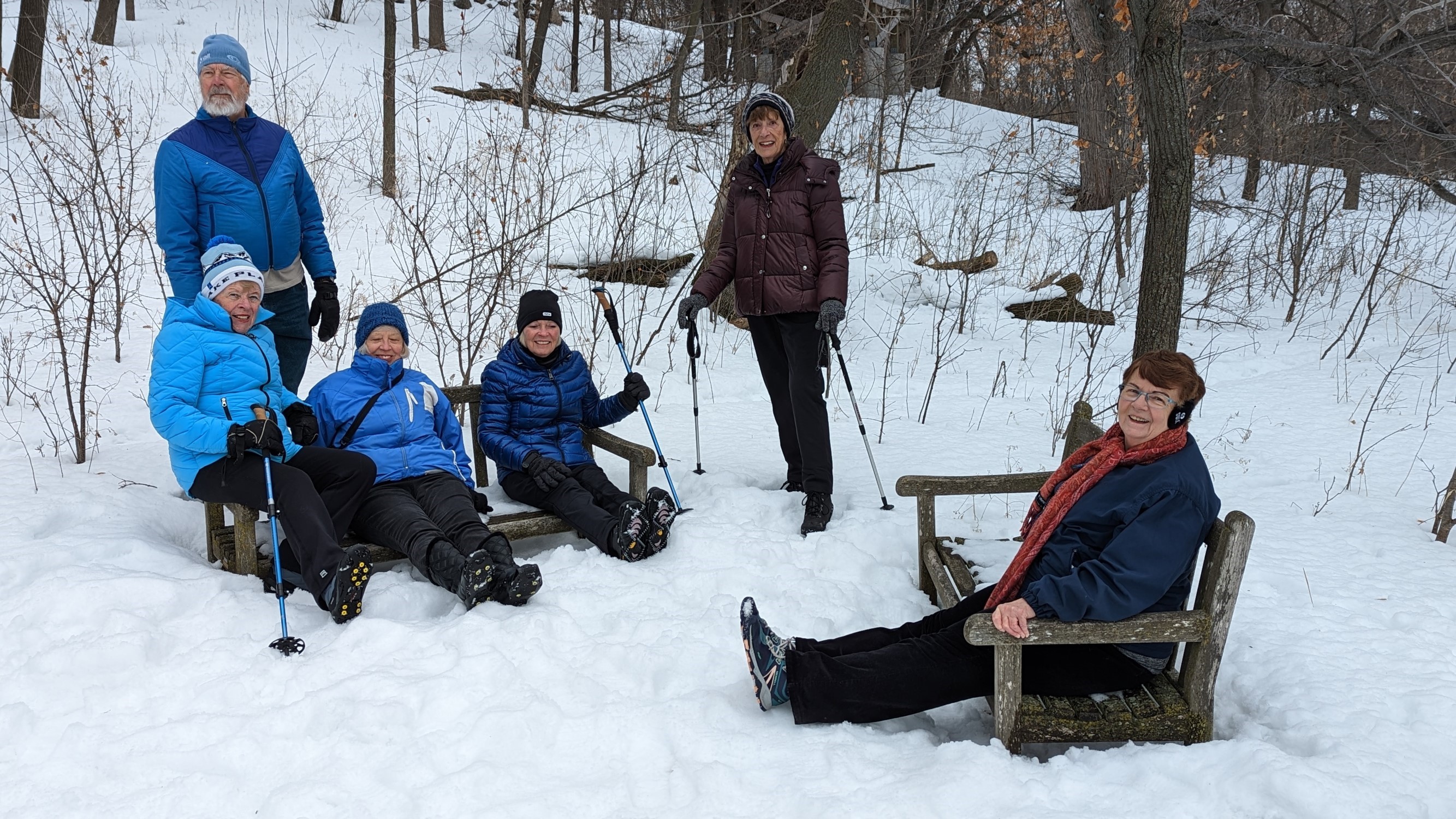 Westwood Nature Center Hike After a couple of false starts (everything looks different with snow cover), we had a decent hike. About 3 miles on uneven frozen ground. Jim Habeck, Barb Kolbe, Jan Swanberg, Karen Holmquist, Nancy Sand and for a little while Sandra Shearer were the brave souls who joined me. Sandra decided to go home after a short jaunt. This was not the hike I was thinking about when I planned it. Who knew we'd get this much snow and refreezing. March is a very unpredictable month. You can see from one picture, that the snow was up to the bottom of the benches. Let's hope April is better. I'm tried of my hikes and other events being changed or canceled due to weather! |