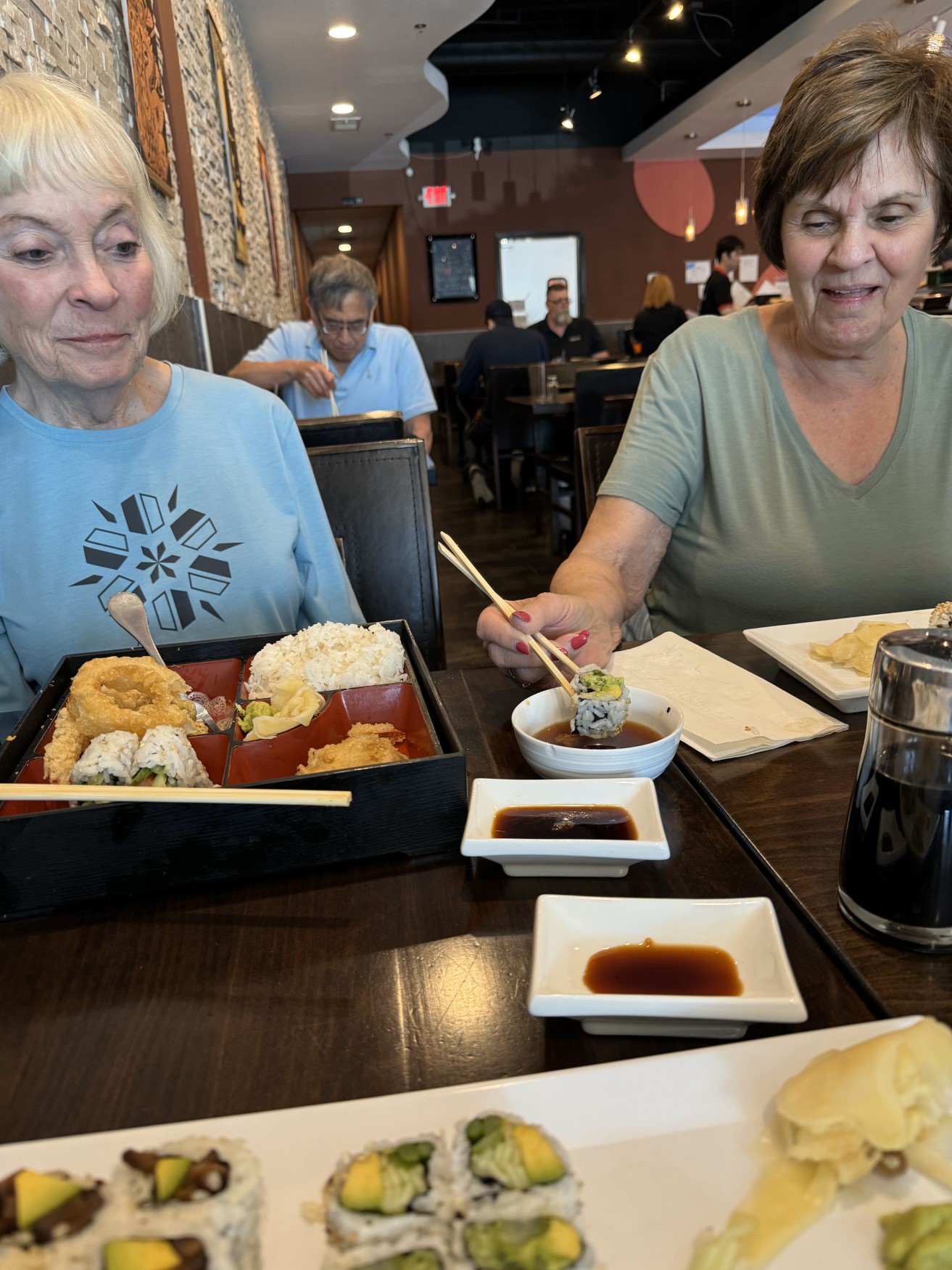 Lunch was interesting. Patty and Cheryl tried the chopsticks, Nancy used a fork and Linda and I used our fingers.
